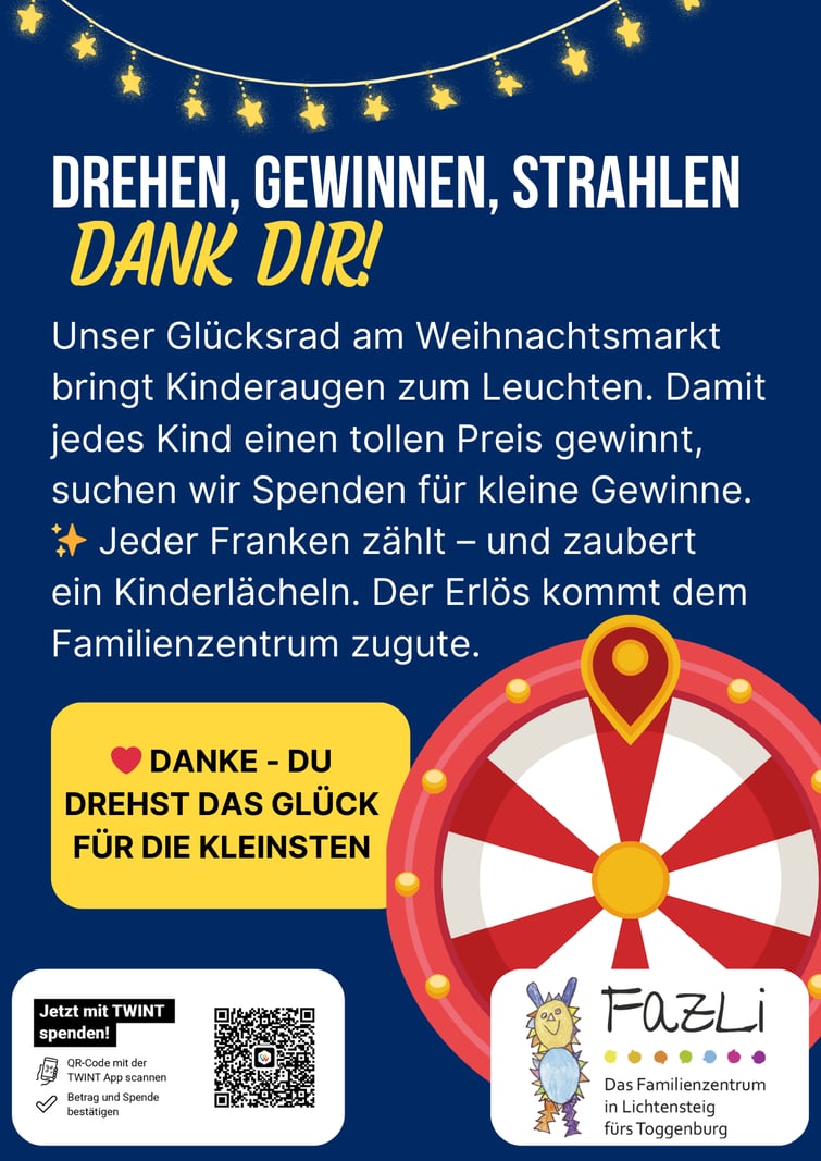 Am diesjährigen Lichtensteiger Klaus- und Weihnachtsmarkt vom 6. und 7. Dezember ist das FazLi mit einem Glücksrad dabei. Damit jedes Kind einen tollen Preis gewinnt, suchen wir Spenden für kleine Gewinne. Hier kannst du direkt via Twint eine Spende tätigen: https://donate.raisenow.io/ykwdh. Vielen herzlichen Dank!