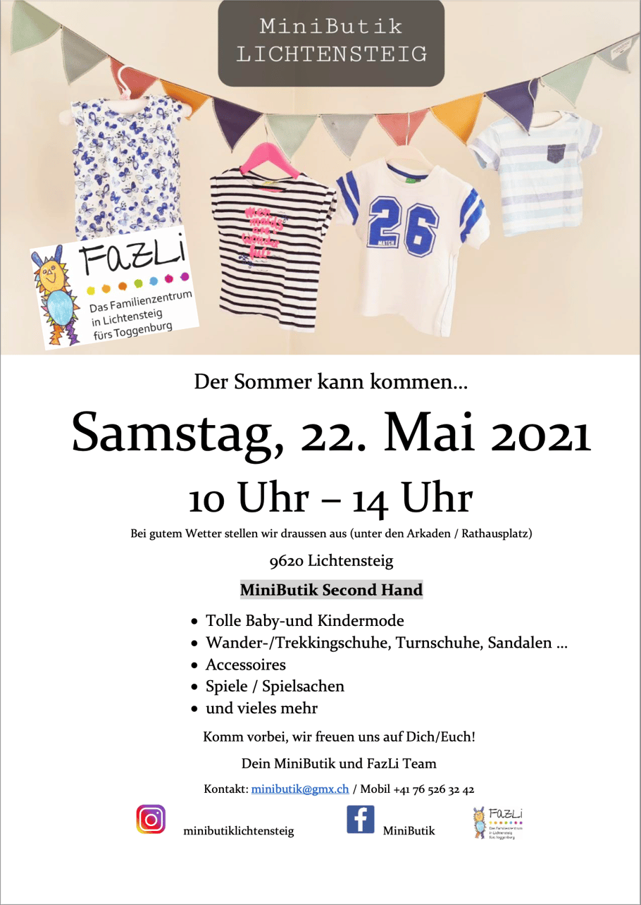 An diesem Samstag ist im Städtli ohnehin viel los. Es findet ein weiterer Super Saturday statt. Auch das FazLi öffnet seine Türen. Geniessen Sie von 10.00 bis 16.00 Uhr einen Kaffee und stöbern Sie in der Mini.Butik. Von 10.00 bis 12.00 Uhr gibt es von der Mini.Butik einen tollen Frühlings- und Sommerverkauf. Herzlich Willkommen!