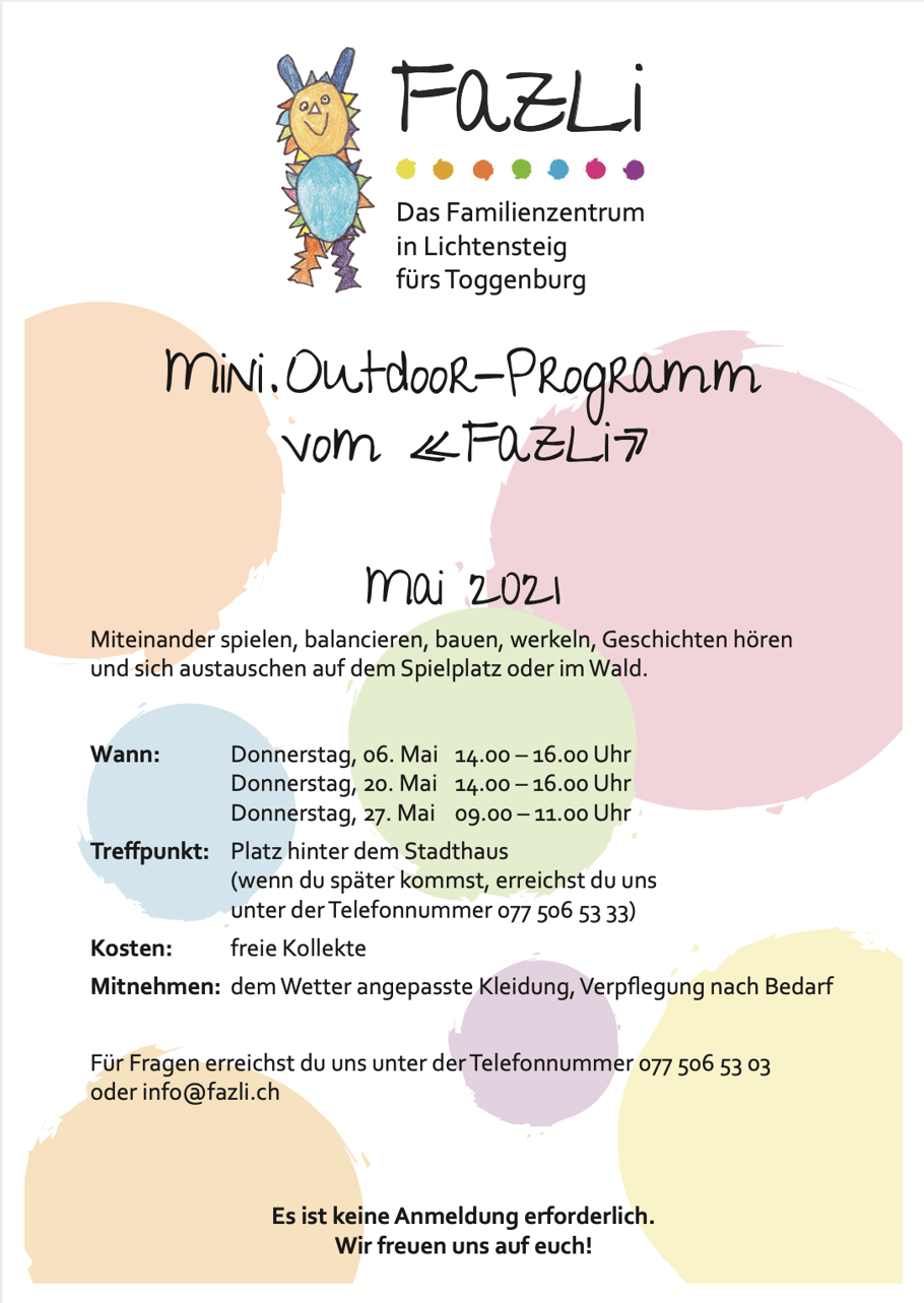 Vom 20. Juli bis 8. August 2023 macht das FazLi Sommerpause. Mütter und Väter Beratungsangebote finden über den Sommer normal statt. Siehe www.muetterberatung-toggenburg.ch
